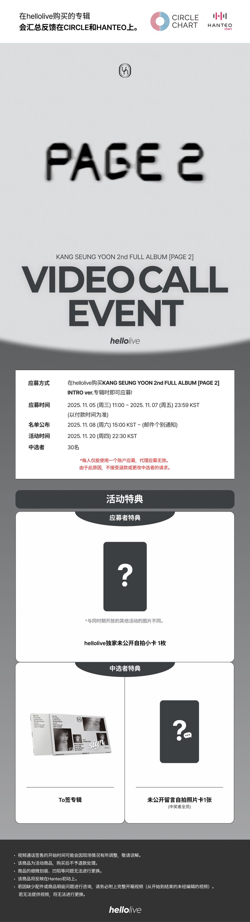 📆 应募时间 2025. 11. 05 (周三) 11:00 ~ 2025. 11. 07 (周五) 23:59 KST ⏰ 活动时间 2025. 11. 20 (周四) 22:30 KST 📍中奖名单公布 2025. 11. 08 (周六) 15:00 KST ~ (邮件个别通知) 🙋中奖人员 视频通话: 30名 🔎 应募者特典 hellolive独家未公开自拍小卡 1枚