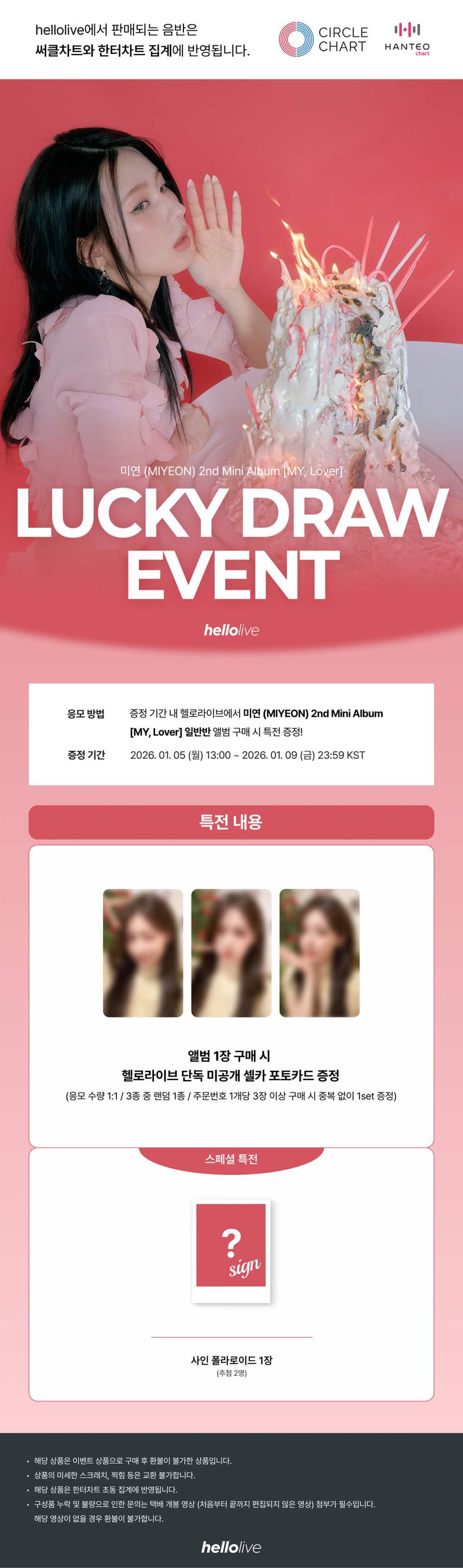 [LUCKY DRAW EVENT 2] 미연 (MIYEON) 2nd Mini Album [MY, Lover] 📆 응모기간 2026. 01. 05 (월) 13:00 ~ 2026. 01. 09 (금) 23:59 KST 🔎 응모자 특전 앨범 1장 구매 시 헬로라이브 단독 미공개 셀카 포토카드 증정 구매자 추첨 2명 사인 폴라로이드 증정